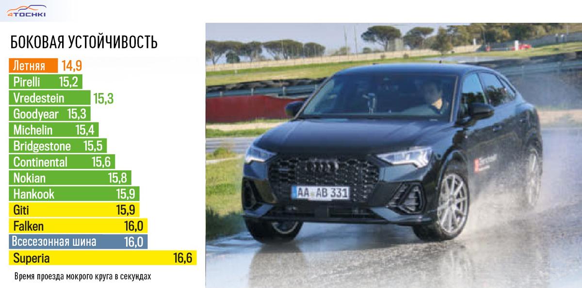 КРУГОВАЯ ТРАССА. Высокая боковая устойчивость на мокрой дороге обеспечивает запас безопасности в поворотах. В то время как разрывы между шинами в лидирующей группе незначительны, в нижней части протокола результаты сильно разнятся. Неожиданность - скромный результат всесезонной шины.