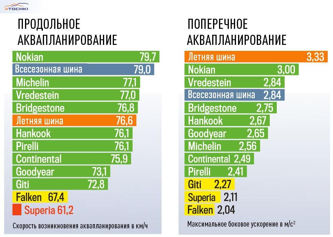 ПРОДОЛЬНОЕ АКВАПЛАНИРОВАНИЕ. Внезапное всплытие шин опасно, поскольку системы ESP и ABS могут помочь только при контакте с дорогой. Особенно хорошо отводит воду Nokian. Falken уже на критическом уровне, а Superia просто катастрофична.
