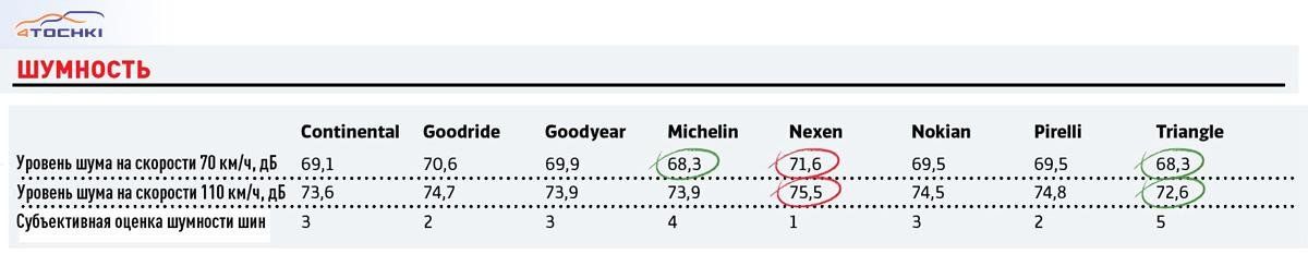 Шум в салоне измерялся шумомером, который фиксировал среднее значение в течение десяти секунд на уровне ушей водителя, однако субъективная оценка дорожного шума имеет более значимый вес в итоговой оценке. Triangle впечатляет ровным и однородным звуком без раздражающих резонансов или частот. Звуковой профиль Michelin также является мягким для уха. Полной противоположностью является Nexen с пульсирующими резонансами, похожими на звук неисправного ступичного подшипника. Pirelli негативно удивляет наличием раздражающих частот на высоких скоростях.