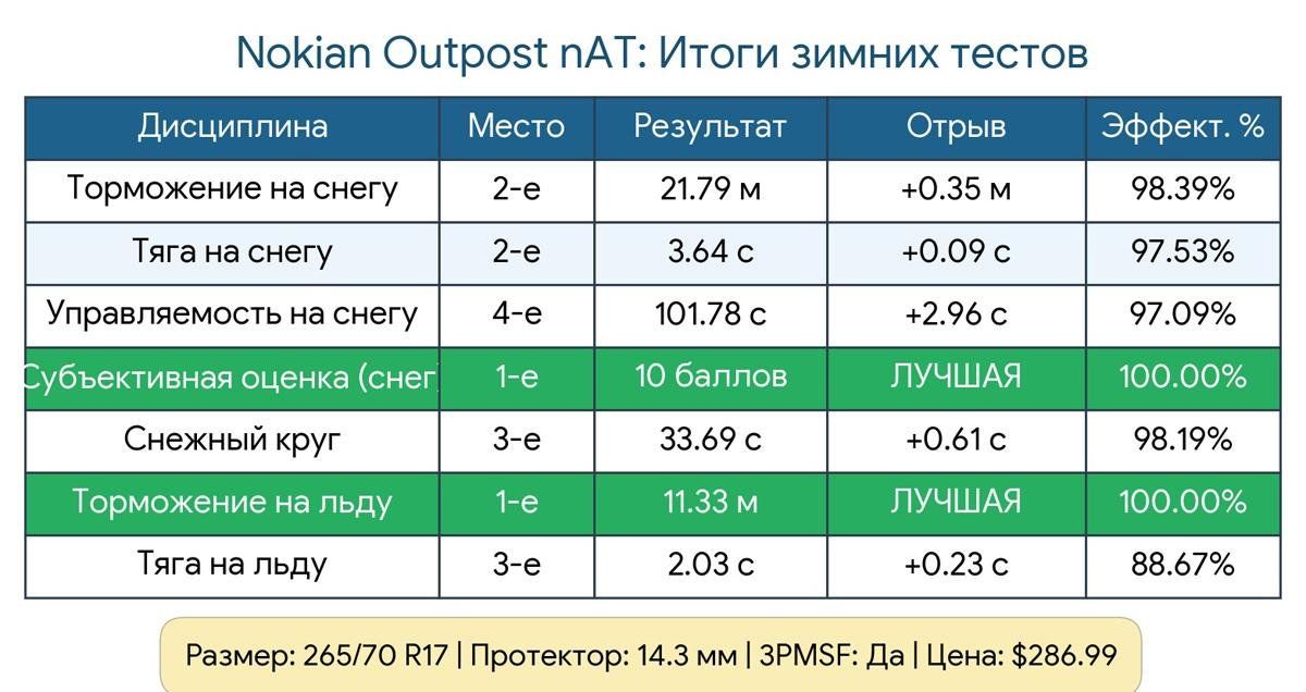 Итак, Nokian Outpost nAT является лучшей вседорожной шиной для зимы. Хотя её единственным выдающимся достижением было торможение на льду, она показала себя хорошо и стабильно во всех тестовых дисциплинах, без каких-либо серьёзных недостатков, что привело к уверенному первому месту.