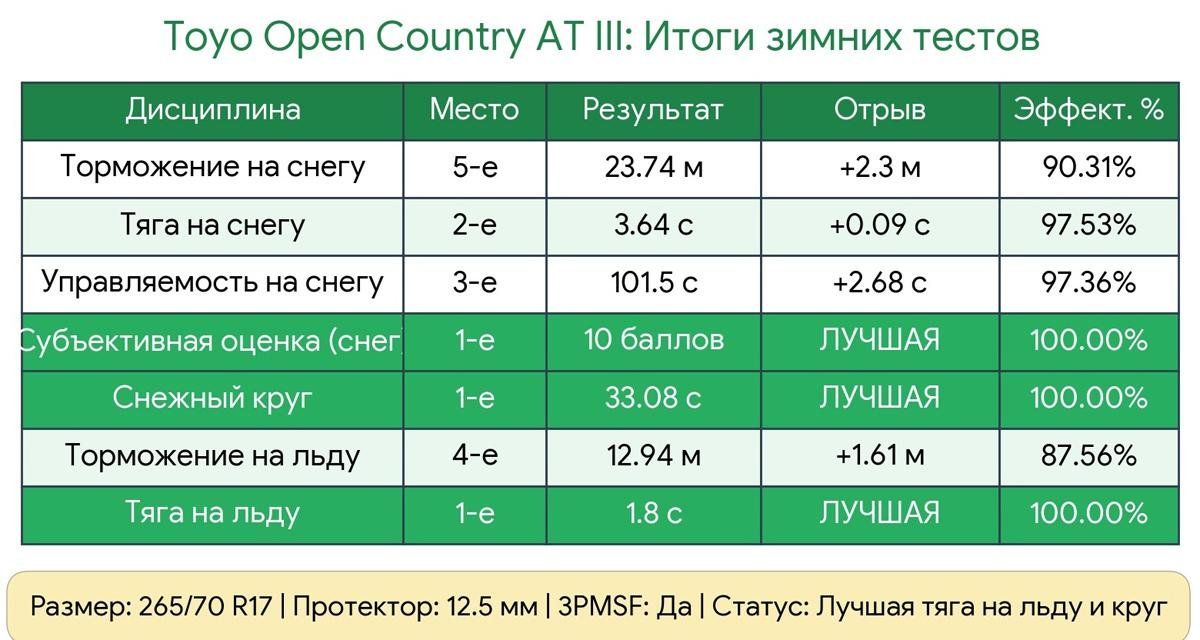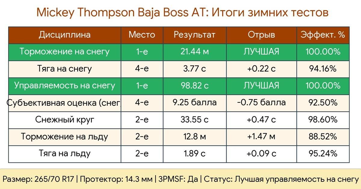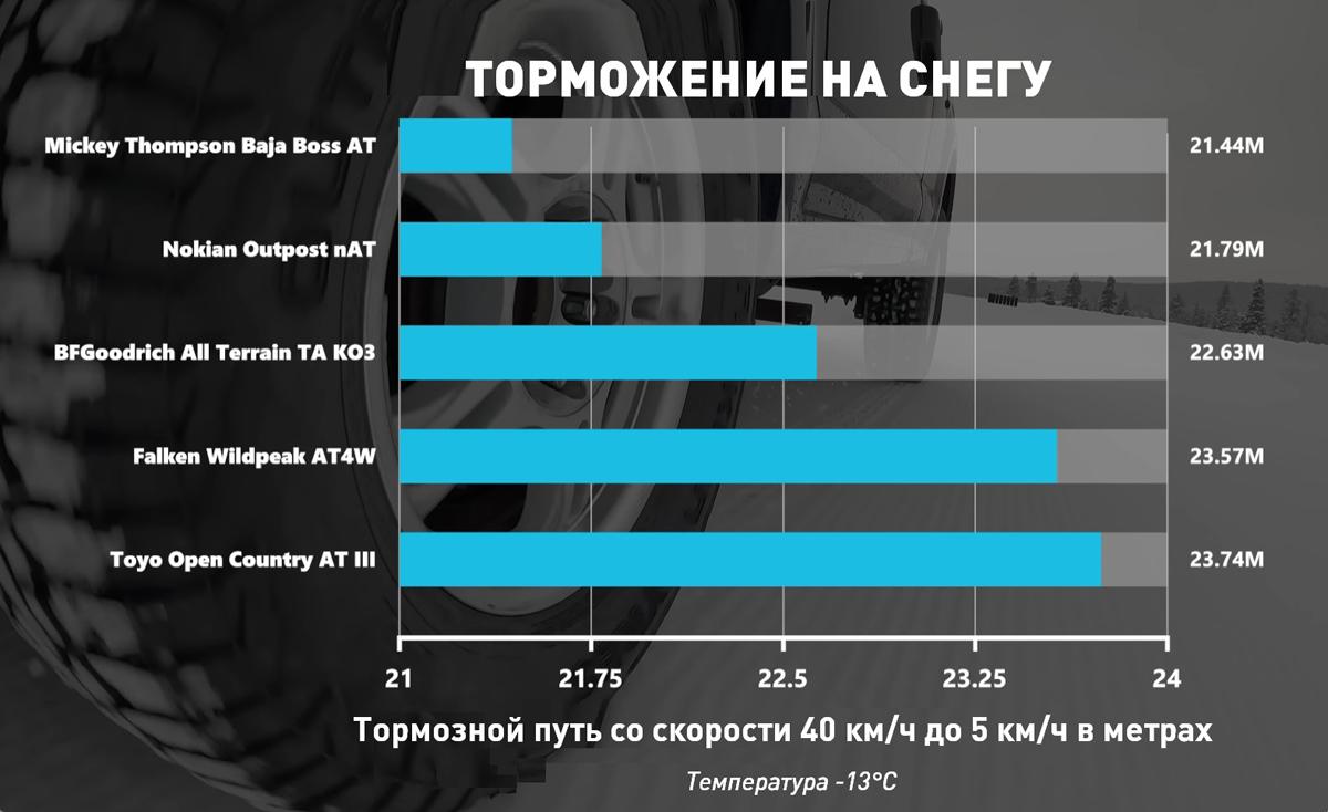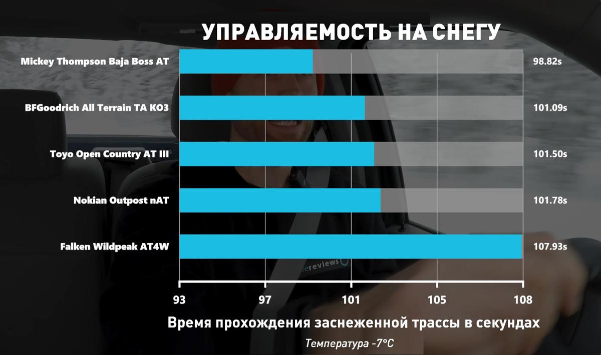 А лучший усредненный результат показала шина Nokian Tyres, продемонстрировав наилучшее торможение и приемлемую тягу. Mickey Thompson вновь оказалась довольной сильной, а Toyo показала хороший уровень тяги.