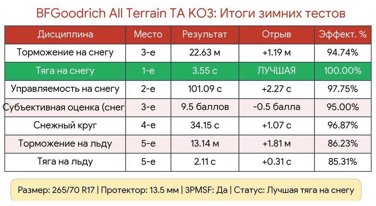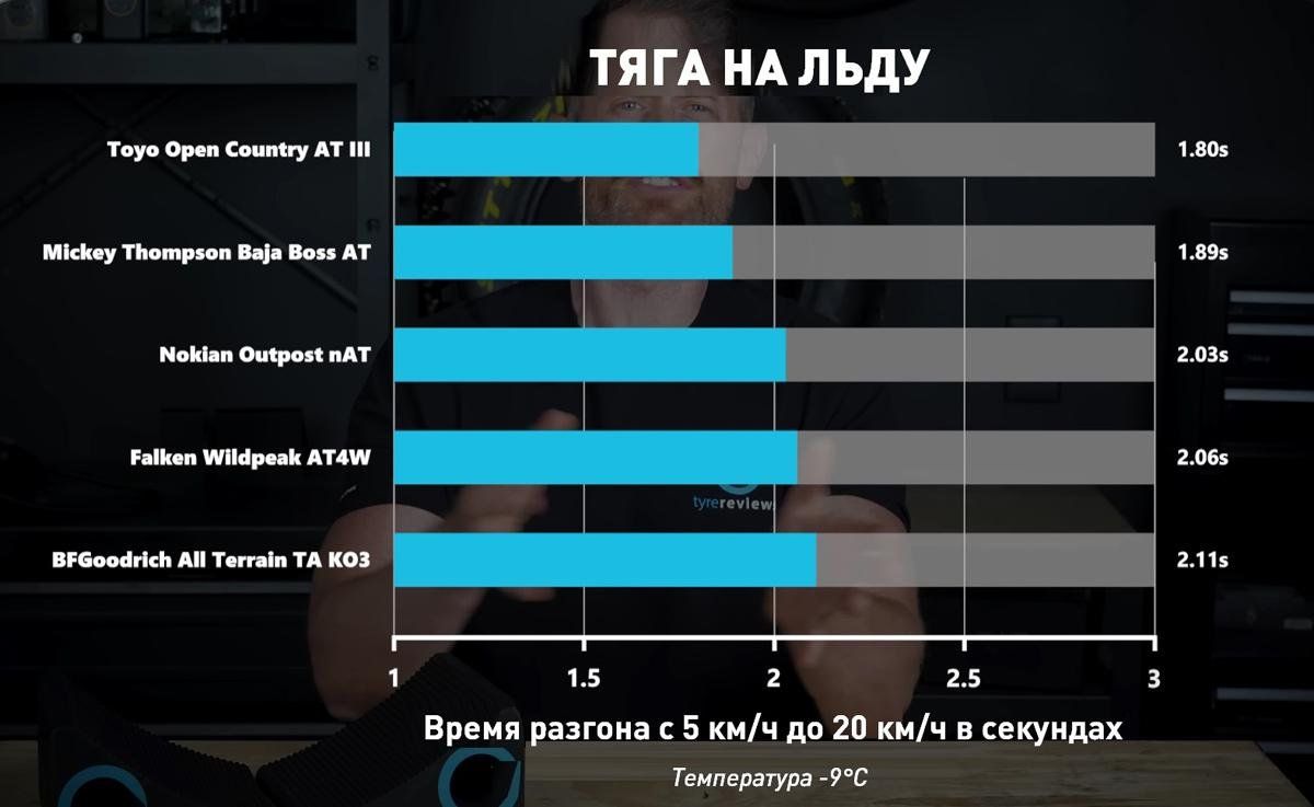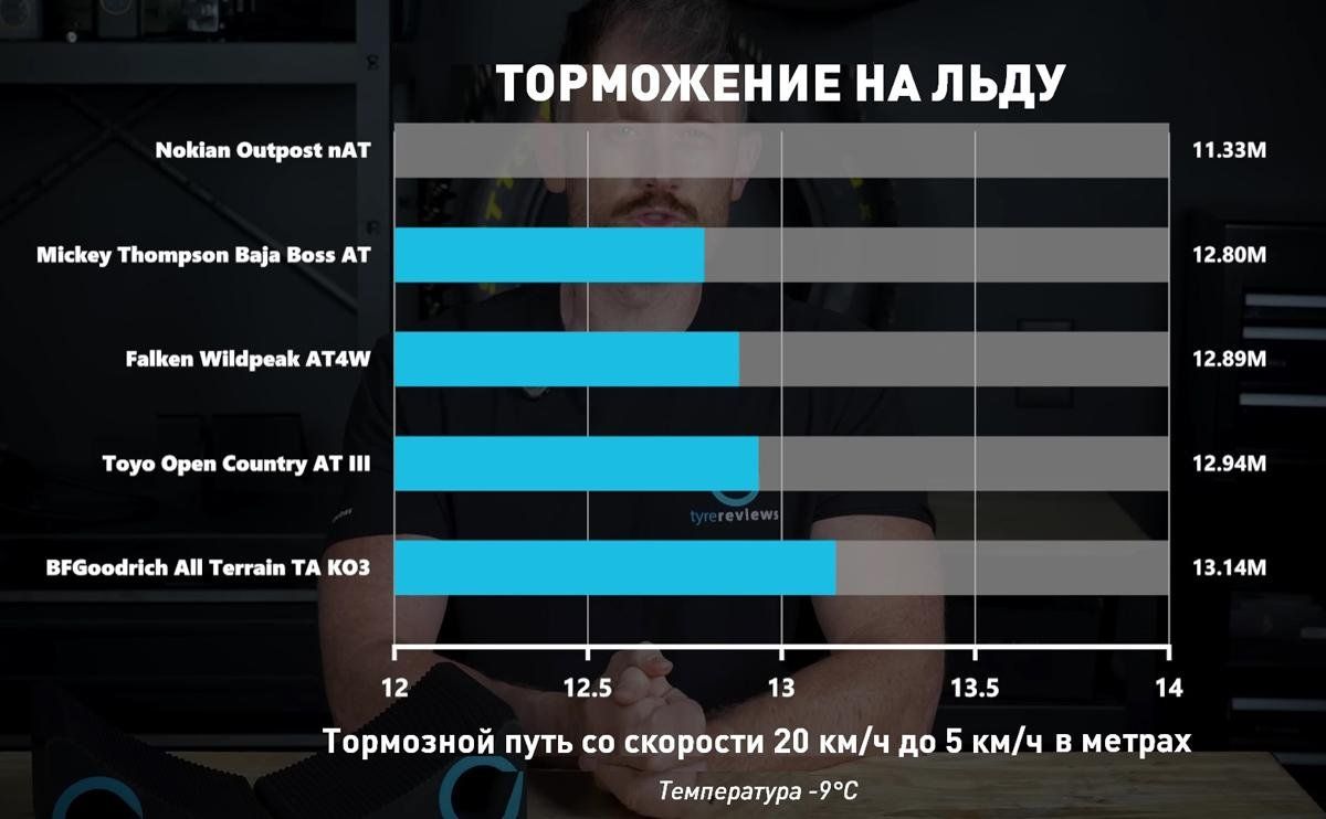 Интересно, что шина BFGoodrich All Terrain T/A KO3, которую большинство шинных экспертов считают эталоном вседорожных шин для зимних условий, совершенно не справилась с испытаниями на льду, уверенно заняв последнее место как в тяге, так и в торможении. Это, действительно, любопытно, и у Джонатана Бенсона пока нет объяснения этому.