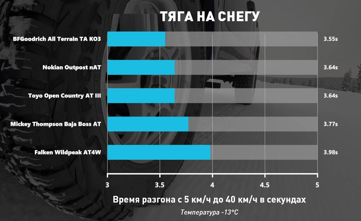 Далее, с почти равными результатами, шли шины Nokian Tyres Outpost nAT, Toyo Open Country A/T III и BFGoodrich All Terrain T/A KO3.